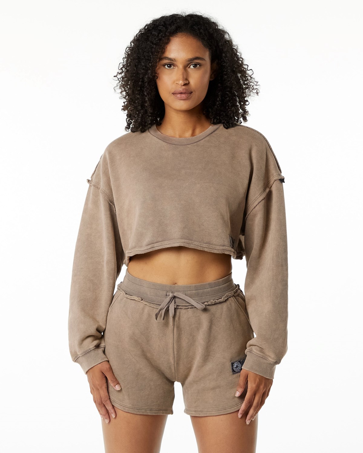 Alphalete Women Heavyweight Washed Terry Crop Pullover Smokey Quartz - Alphalete CZ